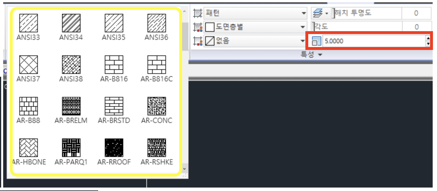 혹은, 해치된 곳을 클릭하면 상단에 밑에 그림처럼 축적과 패턴 선택과 변경이 가능