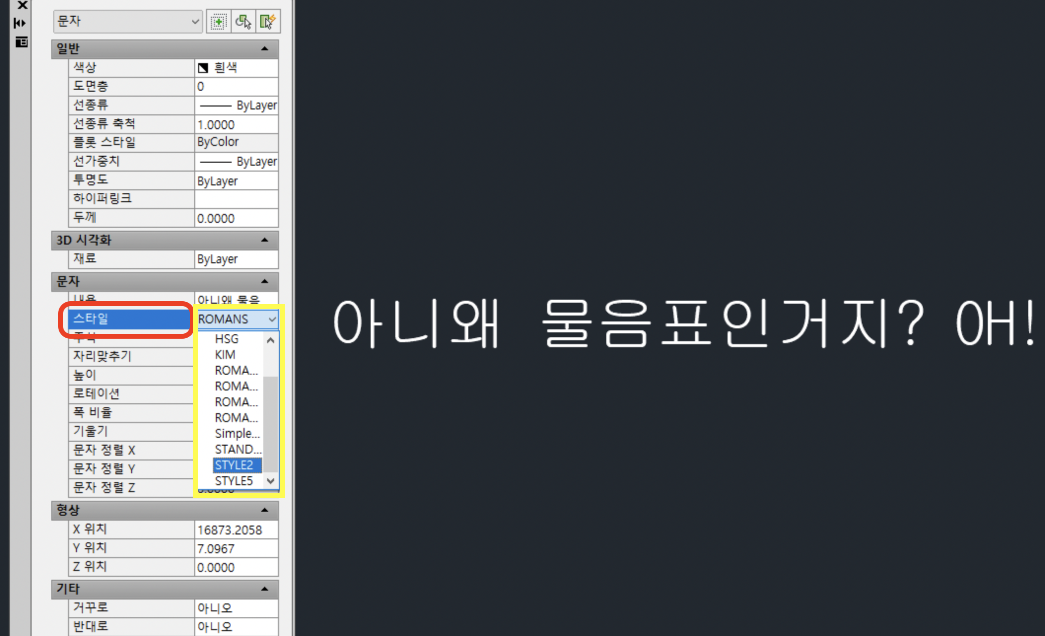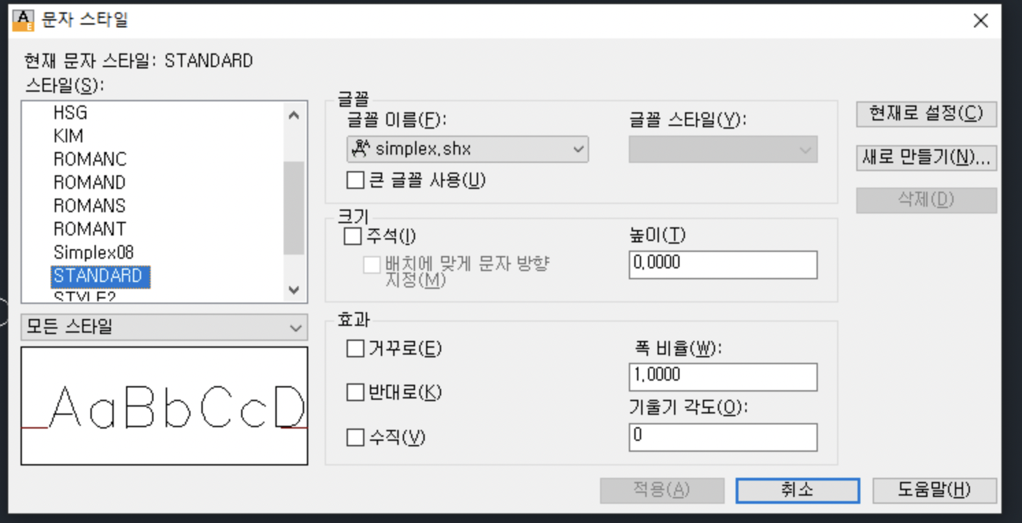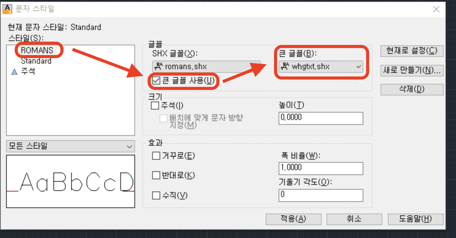 캐드내의 기본 글꼴인 ROMANS 글씨체는