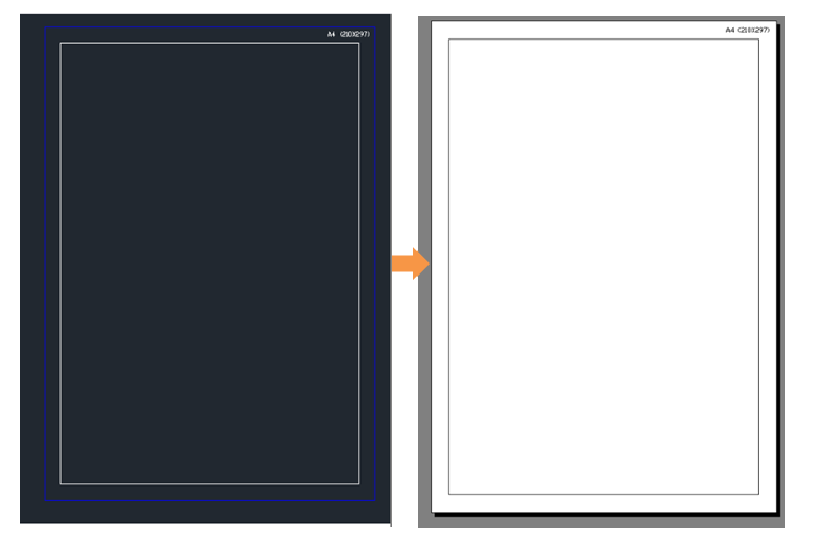 왼쪽 까만 바탕의 작업화면 이미지의 파란색 외형 선은 오른쪽 인쇄 미리보기 화면에서 보이지 않는다.