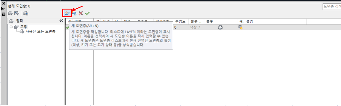 도면층을 생성하기 위해서는, 도면층 리스트 위의 새 도면층 (단축키 : alt+n) 클릭