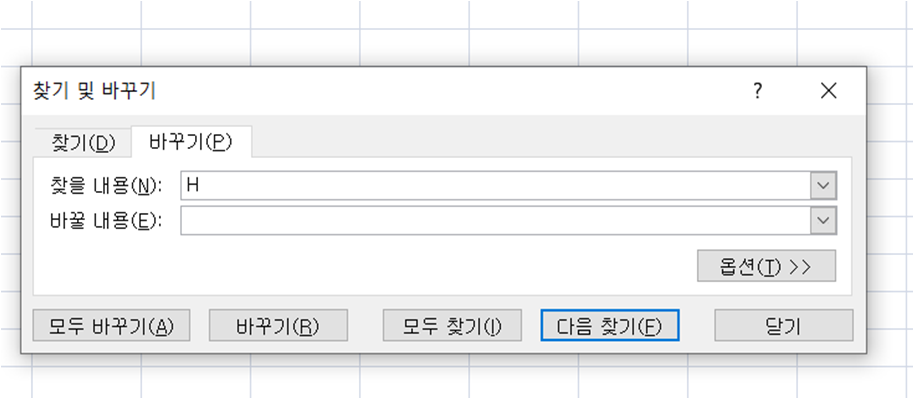 찾을 내용에 "H" 바꿀내용 "" (아무것도 입력하지 않기)