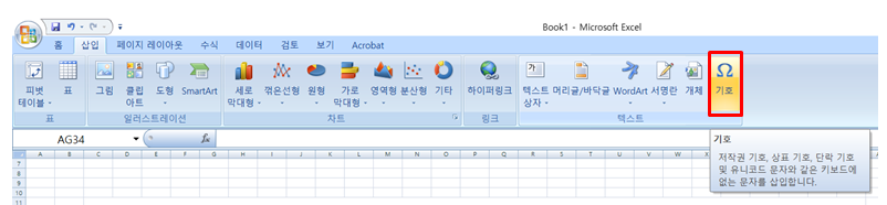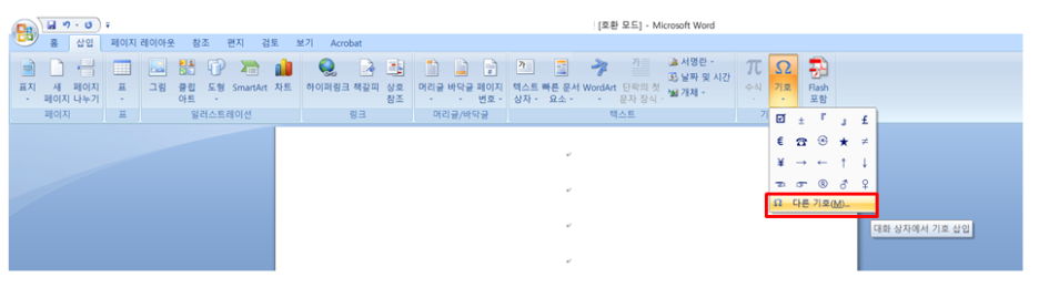 메뉴 탭 -> 삽입 -> 기호 -> 다른기호