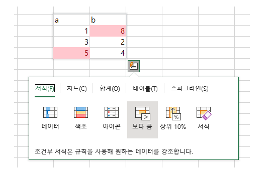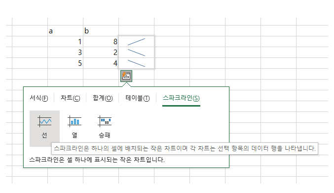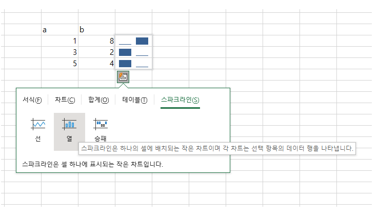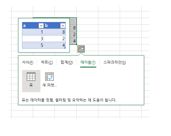 아래 네모에 서식, 차트 ,합계, 테이블, 스파크 라인 등 메뉴 탭에서 볼수 있는