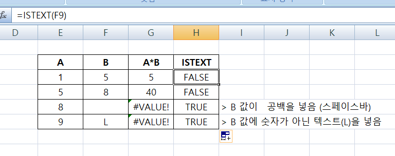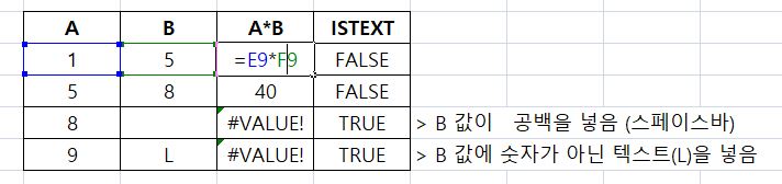 -> ISTEXT(B) 로 설정해서 확인해보니, 값이 잘못되었을때