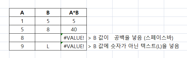 A*B 수식에서 B의 값에 공백과 텍스트가 있으니 발생