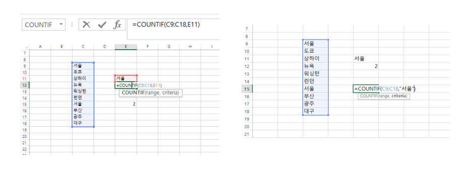 서울이 적힌 셀을 지정도 가능