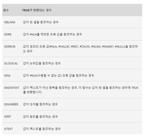 ISERROR는 모든 오류값에 대해 TRUE/FALSE를 확인해 주는것이었다면,