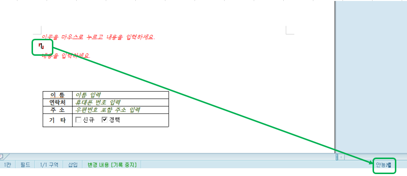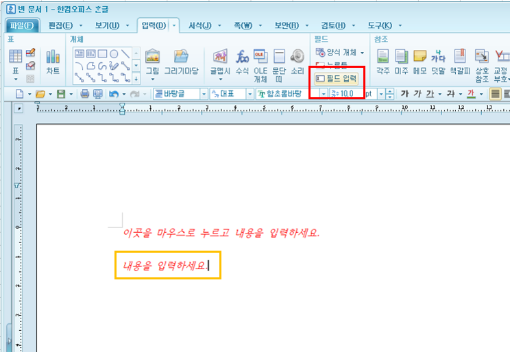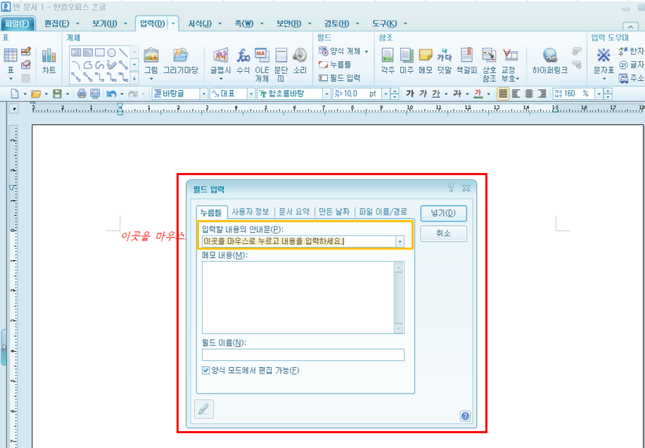 * 입력 -> 필드의 "누름틀"
