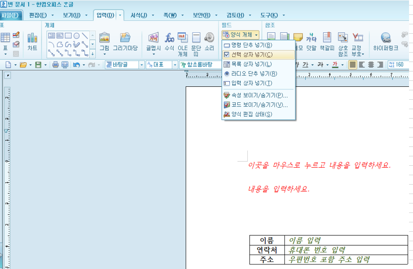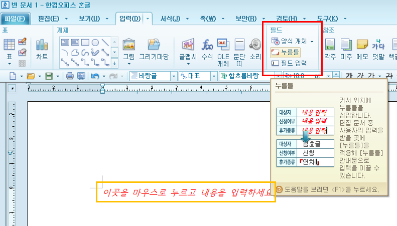 * 입력 -> 필드 -> 누름틀, 필드입력, 양식개체 등등..