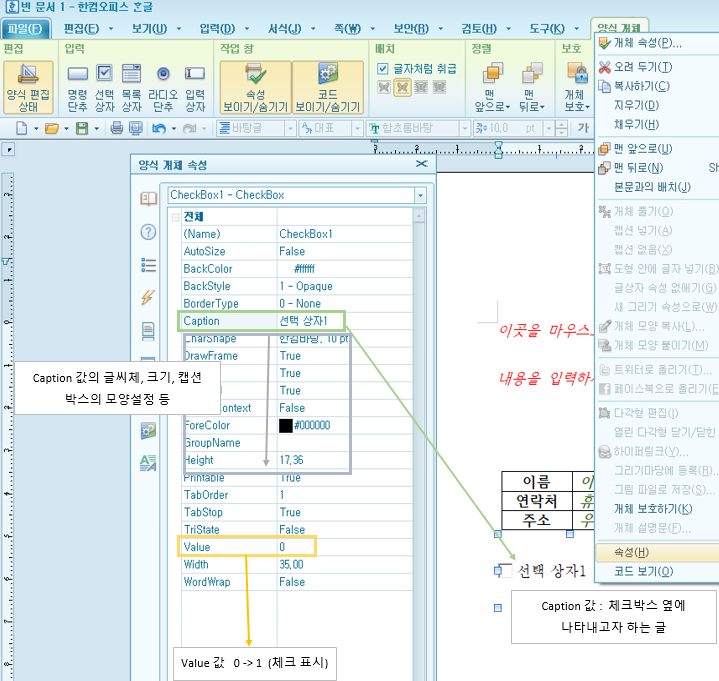 * 입력 -> 양식개체의 "선택상자 넣기"