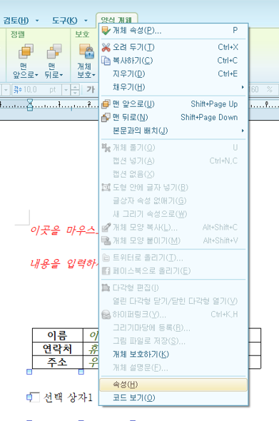 문구 변경시, 클릭 -> 마우스 오른쪽 -> 속성